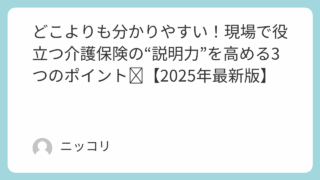 お仕事のお悩み解決 どこよりも分かりやすい!現場で役立つ介護保険の“説明力”を高める3つのポイント✨【2025年最新版】 介護現場で「介護保険って何?」と聞かれて困ったことはありませんか?この記事では、利用者や家族に分かりやすく説明できる3つのポイントを紹介。どこよりも分かりやすく、今日から使える実践スキルをまとめました!💬どこよりも分かりやすい!現場で役立つ... 2025.10.14 お仕事のお悩み解決介護情報