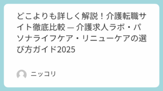 お仕事のお悩み解決 どこよりも詳しく解説!介護転職サイト徹底比較 — 介護求人ラボ・パソナライフケア・リニューケアの選び方ガイド2025 介護職に特化した転職サイト「介護求人ラボ」「パソナライフケア」「リニューケア」を徹底比較。求人数・サポート体制・地域特化などの特徴と選び方を初心者向けにわかりやすく解説。これから転職を考える人必見のガイドです✨ どこよりも詳しく解説!介護転職サイト徹底比較 2025.10.16 お仕事のお悩み解決介護情報介護職転職情報