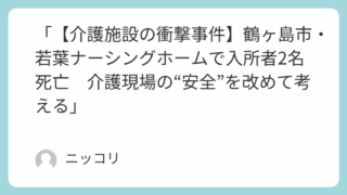 お仕事のお悩み解決 【続報】鶴ヶ島市・若葉ナーシングホーム事件から考える『介護施設に求められる“安全管理力”と現場の課題』 🩸【衝撃の事件】静かな夜を襲った悲劇2025年10月15日未明、埼玉県鶴ヶ島市にある介護付き有料老人ホーム「若葉ナーシングホーム」で、入所者の高齢女性2名が頭から血を流して倒れているのが発見され、搬送先の病院で死亡が確認されました。施設の防... 2025.10.17 お仕事のお悩み解決事故から学ぶ介護情報
